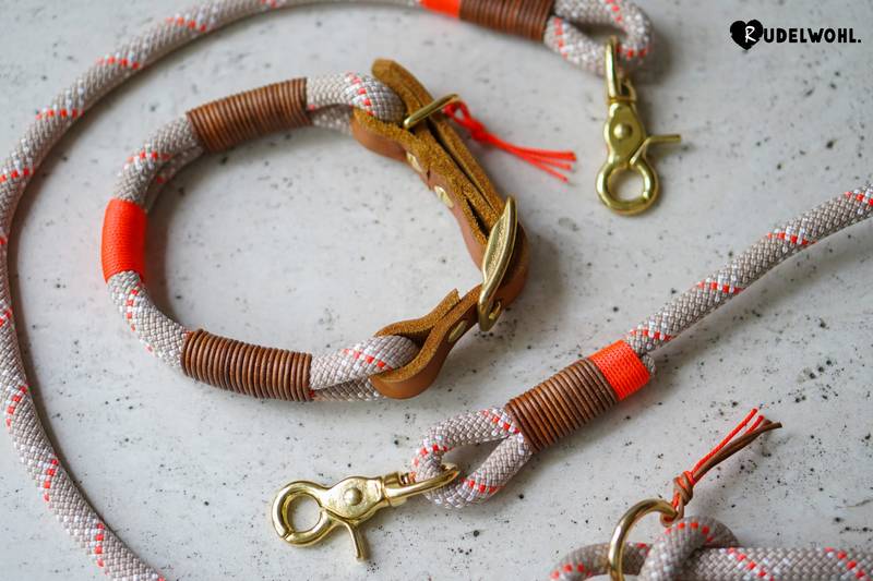 Die Takelung aus Leder in der Farbe Cognac und Takelgarn in Neonorange verleiht dem Set das gewisse Etwas. Die 2 Meter lange Leine lässt sich individuell anpassen, um deinen Bedürfnissen gerecht zu werden. Die Ringe zum Einhaken der Karabiner sind flexibel verschiebbar, damit du die Leine bequem an deinen Bauchumfang anpassen oder als Schulterleine um den Oberkörper tragen kannst.