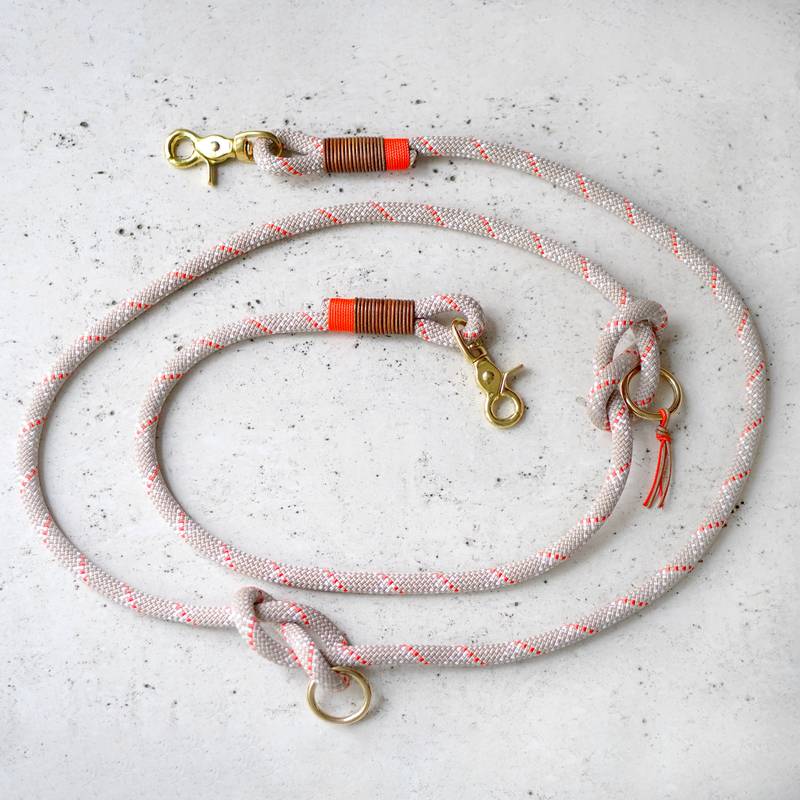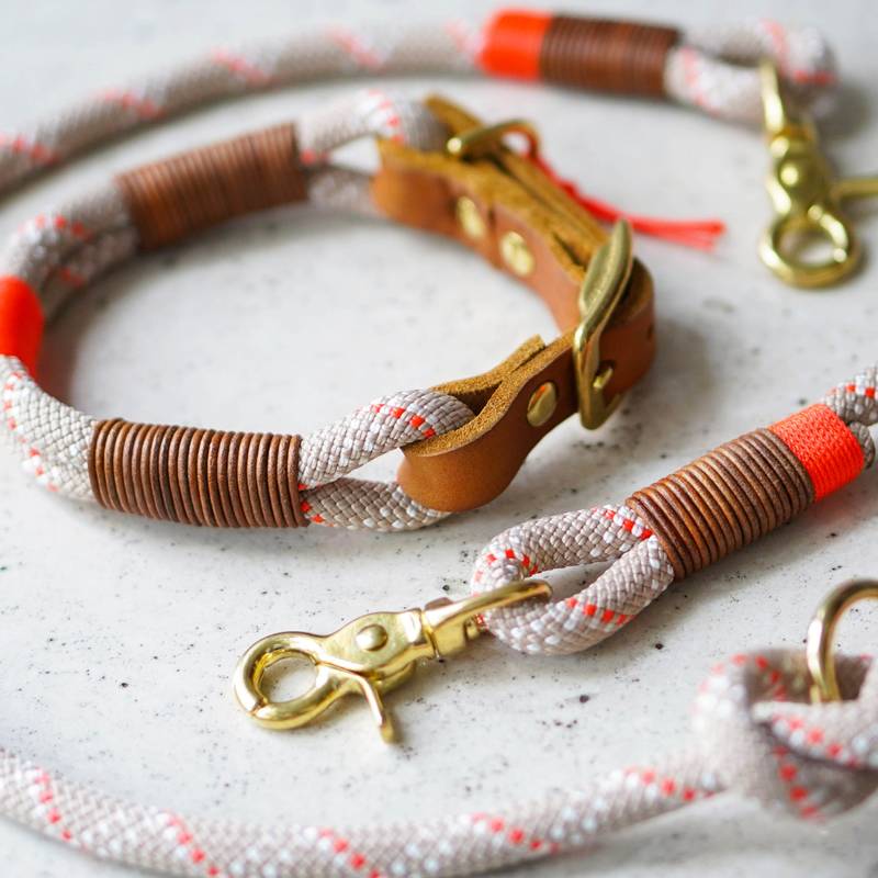 Die handgefertigte "Desert Sun" Hundeleine vereint schlichte Eleganz und Funktionalität. Das 10 mm dicke Kletterseil garantiert Strapazierfähigkeit und Sicherheit für deinen Hund. In hellem Beige mit dezenten Akzenten in Weiß und Neonorange ist diese Leine ein stilvoller Begleiter für eure Spaziergänge.