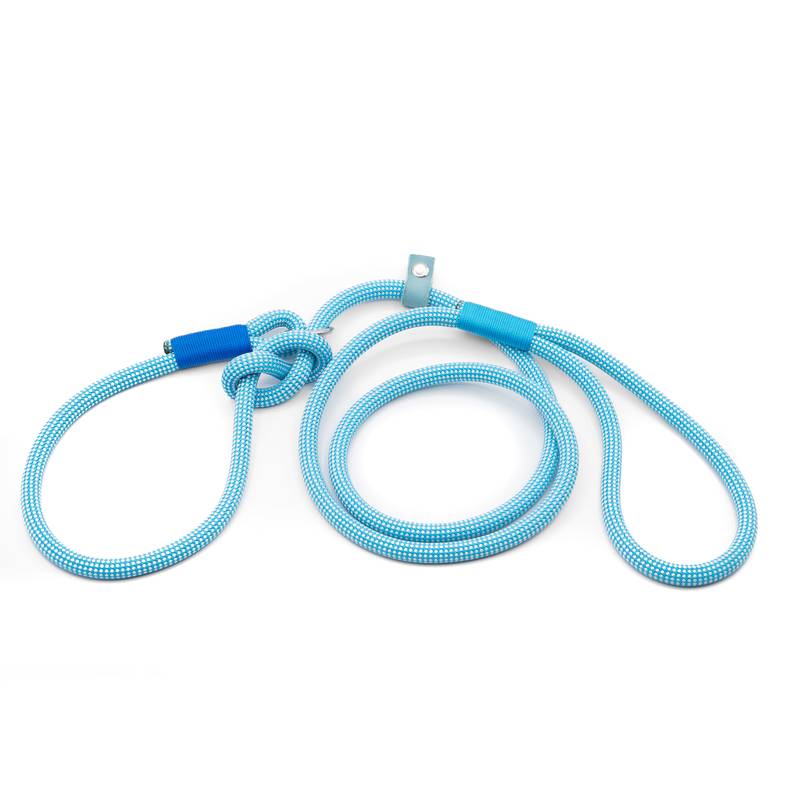 Das Ende der Leine ist mit einer integrierten Halsung versehen, welche wie bei einem Zugstopphalsband über den Kopf Deines Hundes gezogen wird. Eine Strangulierung bei Zug an der Leine wird durch den Knoten verhindert.