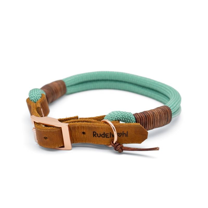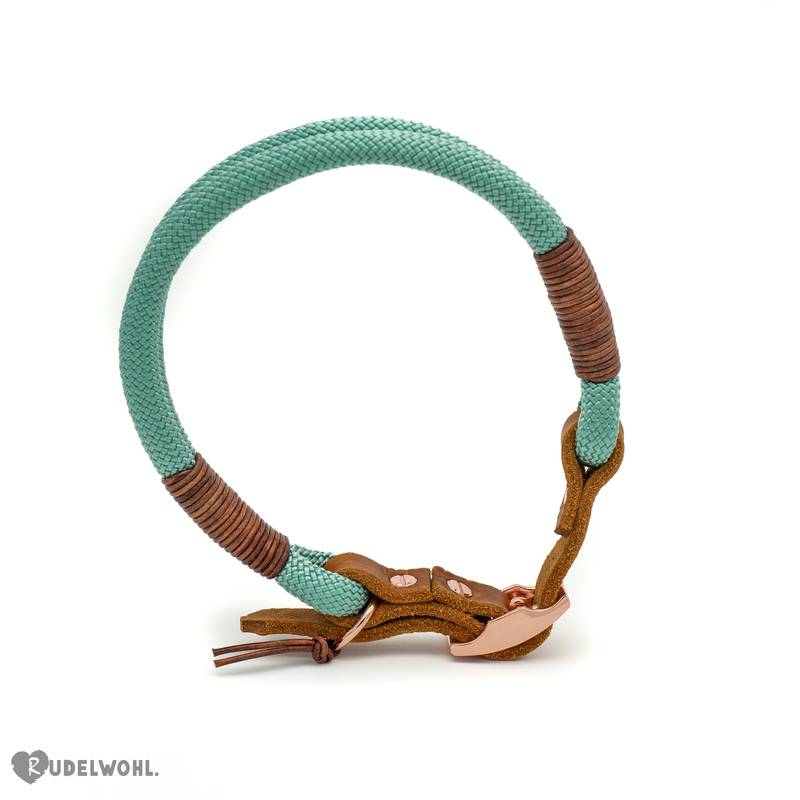 Kombiniert wird das Seil mit einer Takelung in Leder Cognac. Die Beschläge sind frei wählbar in Messing, Roségold oder Silber.