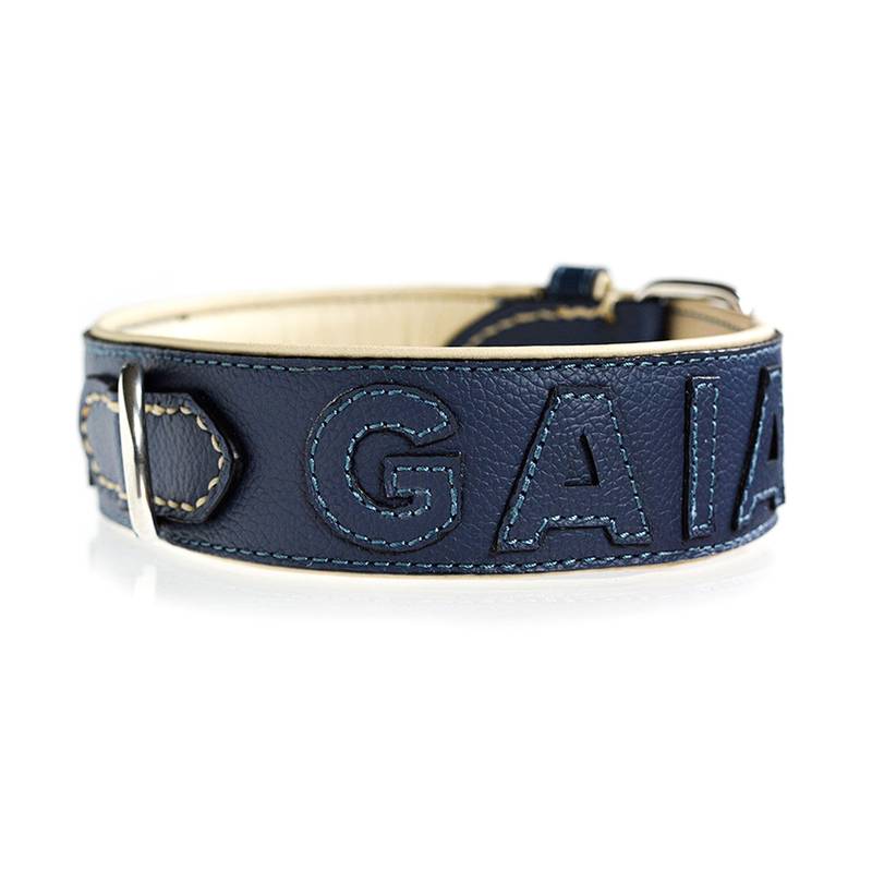 Ein ganz persönlich personalisiertes Lederhalsband in klassischem Blau von gaiaswelt.