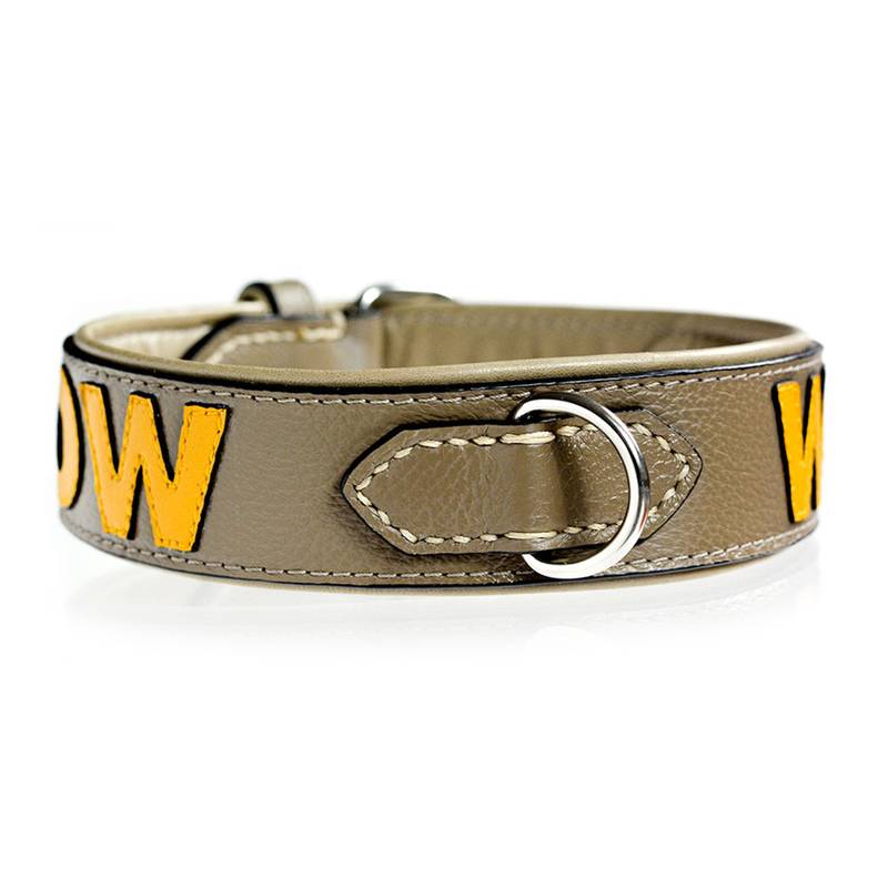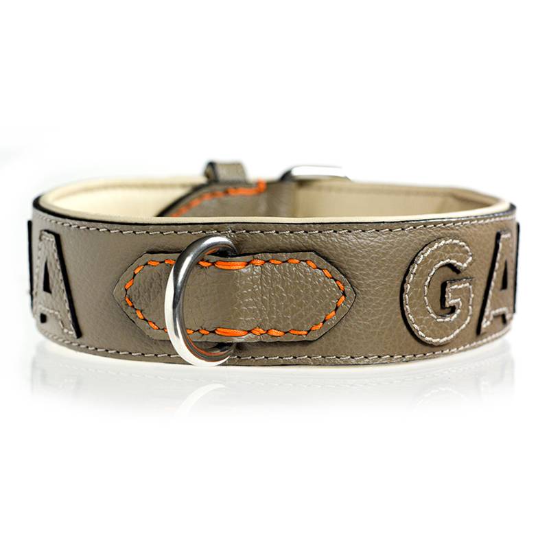 Das Polster beim taupefarbenen Halsband ist in der Regel beige, alternativ gäbe es Schwarz. - Die Buchstaben