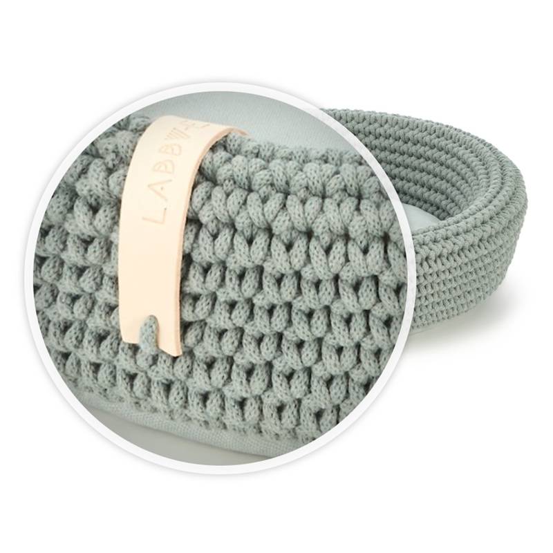 Der runde Rahmen dieses Körbchens ist von Hand aus in sich geflochtenem, zart salbeigrünem Garn gewebt. So entsteht ein stabiler Rand, hinter dem sich Dein kleiner Hund verstecken kann – oder das Köpfchen auflegen, um zu sehen, ob es nicht bald Essen gibt.