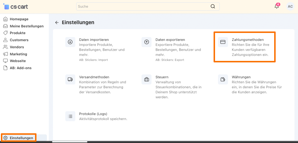 Alle individuellen Zahlungsmethoden werden im iinu Backend unter Einstellungen_Zahlungsmethoden eingerichtet.