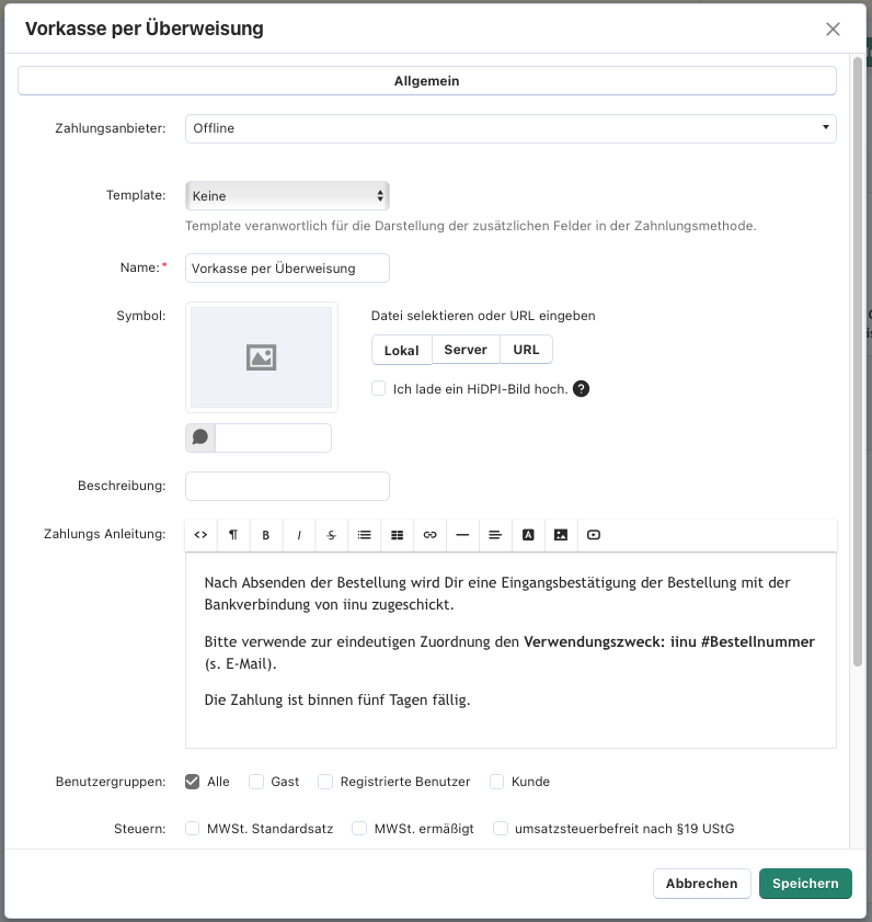 Achtung: bei dieser Zahlungsmethode musst Du selbst Deine Zahlungseingänge im Auge behalten und den Status der Bestellungen im iinu Backend aktualisieren!