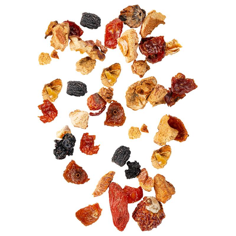 Äpfel* gewürfelt, Hagebuttenschalen*, Birnen* getrocknet, Aroniabeeren* getrocknet, Gojibeeren* getrocknet, Sanddornbeeren* getrocknet und Heidelbeeren* getrocknet