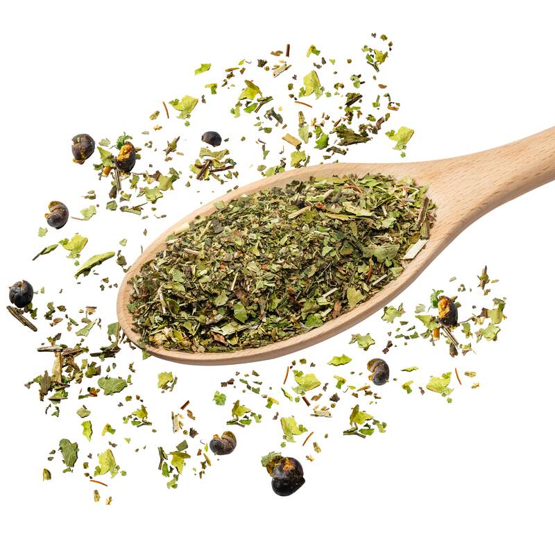 Brennnesselblätter *, Birkenblätter *, Goldrutenkraut *, Spitzwegerichkraut *, Wacholderbeeren *