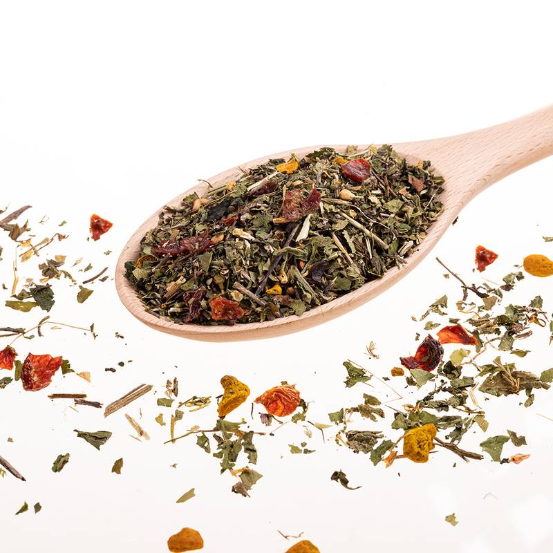 Bio-Augentrostkraut, Bio-Weißdornblätter mit Blüten, Bio-Kurkumawurzel, Bio-Hagebutten, Bio-Löwenzahnblätter, Bio-Brennnesselblätter. Ohne Zusatz- oder Konservierungsstoffe!