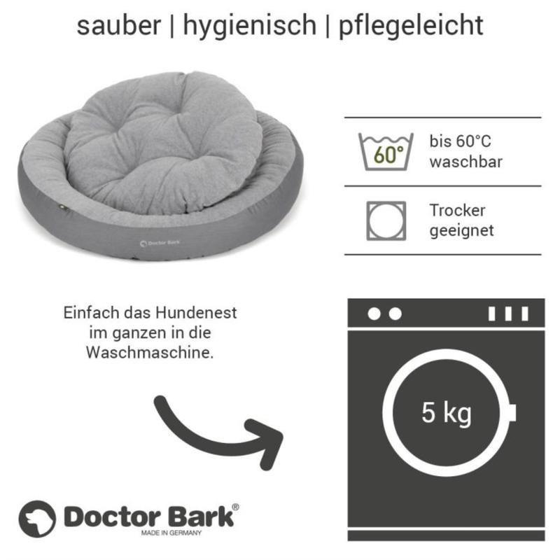Einfach sauber. Das Doctor Bark Hundenest darf bei 60 Grad in der Waschmaschine gewaschen werden – komplett. So werden Schmutz, Bakterien, Hausstaubmilben, Flöhe und deren Hinterlassenschaften, die sich so gerne in Textilien festsetzen, sicher abgetötet und ausgewaschen. So ist das Kuschelbett auch für Allergiker geeignet.