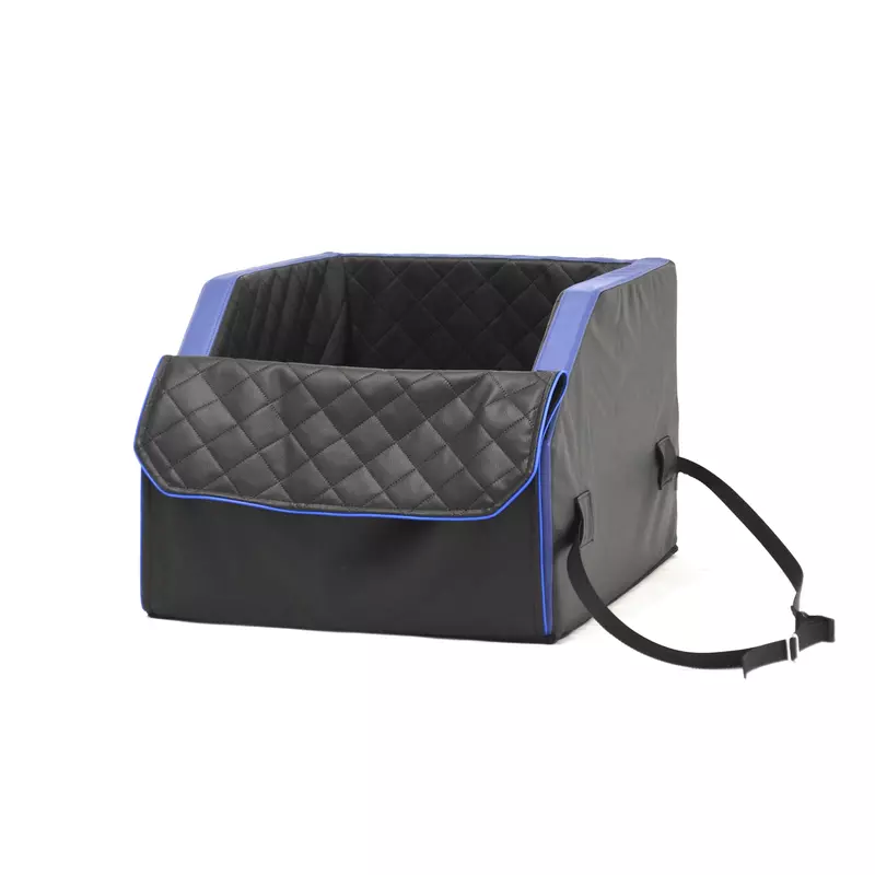 Die Polster-Hundebox ist deshalb mit einem Gurt versehen, mit dem sie an der Rückenlehne befestigt wird. Dieser verläuft entlang der Innenwand des Betts und bietet dort die Möglichkeit, den Hund mit einem Anschnallgurt und Karabiner am Geschirr zu befestigen.