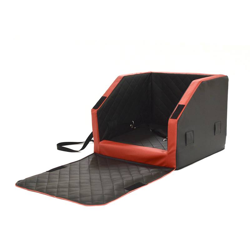 Die Polster-Hundebox ist deshalb mit einem Gurt versehen, mit dem sie an der Rückenlehne befestigt wird. Dieser verläuft entlang der Innenwand des Betts und bietet dort die Möglichkeit, den Hund mit einem Anschnallgurt und Karabiner am Geschirr zu befestigen.