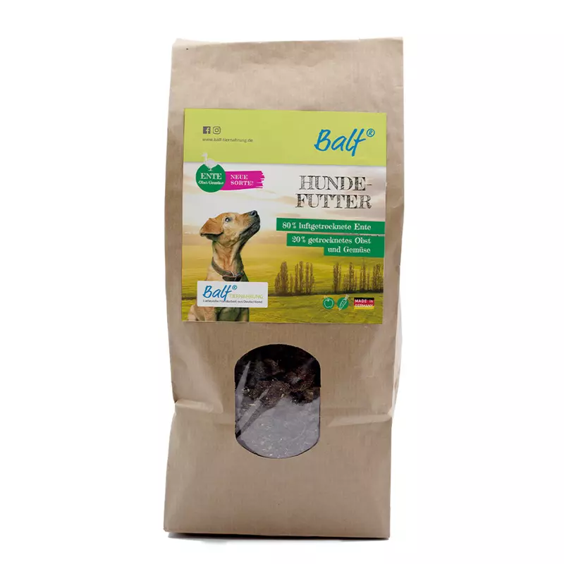 BALF Trockenfutter Ente + Obst + Gemüse versorgt Deinen Vierbeiner ganz natürlich mit hochwertigen Proteinen aus Muskelfleisch und Innereien, einer fein abgestimmten Mischung aus Obst und Gemüse voller Vitamine, Mineralstoffe und sekundärer Pflanzenstoffe.