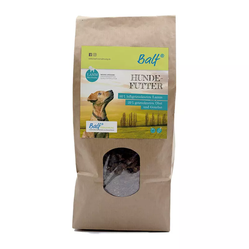 BALF Trockenfutter Lamm + Obst + Gemüse versorgt Deinen Vierbeiner ganz natürlich mit hochwertigen Proteinen aus Muskelfleisch und Innereien, einer fein abgestimmten Mischung aus Obst und Gemüse und wertvollen Kräutern wie Zucchini, Sellerie, Erbsen, Pastinaken, Luzerne, Rote Beete, Apfel, Spinatblätter, Karotten, Holunderbeeren, Weißdornbeeren, Kokos und Löwenzahn – voller Vitamine, Mineralstoffe und sekundärer Pflanzenstoffe.