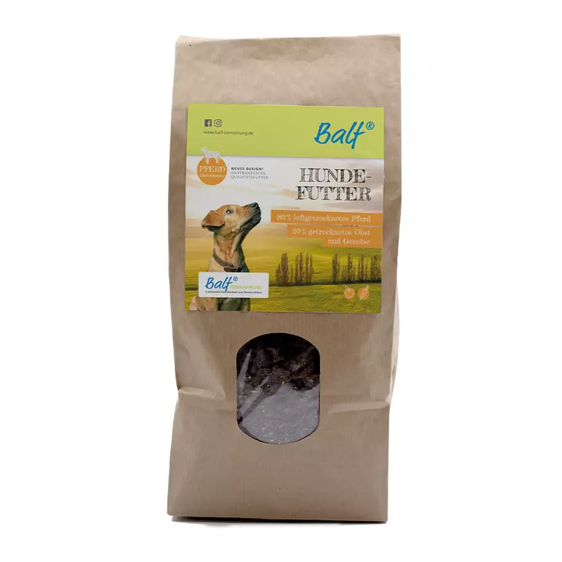 BALF Trockenfutter Pferd + Obst + Gemüse versorgt Deinen Vierbeiner ganz natürlich mit hochwertigen Proteinen aus Muskelfleisch und Innereien, einer fein abgestimmten Mischung aus Obst und Gemüse, wertvollen Kräutern, Algenkalk, Seealgenmehl und Bierhefe.