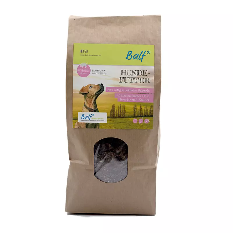 BALF Trockenfutter Schwein + Kräuter versorgt Deinen Vierbeiner ganz natürlich mit hochwertigen Proteinen aus Muskelfleisch und Innereien, einer fein abgestimmten Mischung aus Obst und Gemüse, wertvollen Kräutern, Algenkalk, Seealgenmehl und Bierhefe.