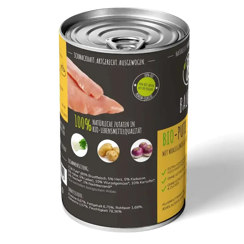 Kombiniert mit einer bekömmlichen Mischung aus Wurzelgemüse und Kartoffeln sowie Nachtkerzenöl, Mineralstoffen, Algenkalk und Knotentang wird die Mahlzeit komplett und versorgt Deinen Vierbeiner mit allem, was ein gesunder Hund braucht. Dank seiner Rezeptur mit hohem Proteinanteil, seiner leichten Verdaulichkeit und Ballaststoffen ist das Bio-Menü mit Pute auch bestens für Senioren geeignet.