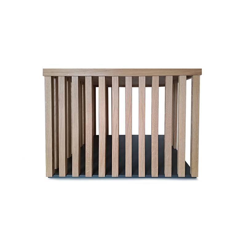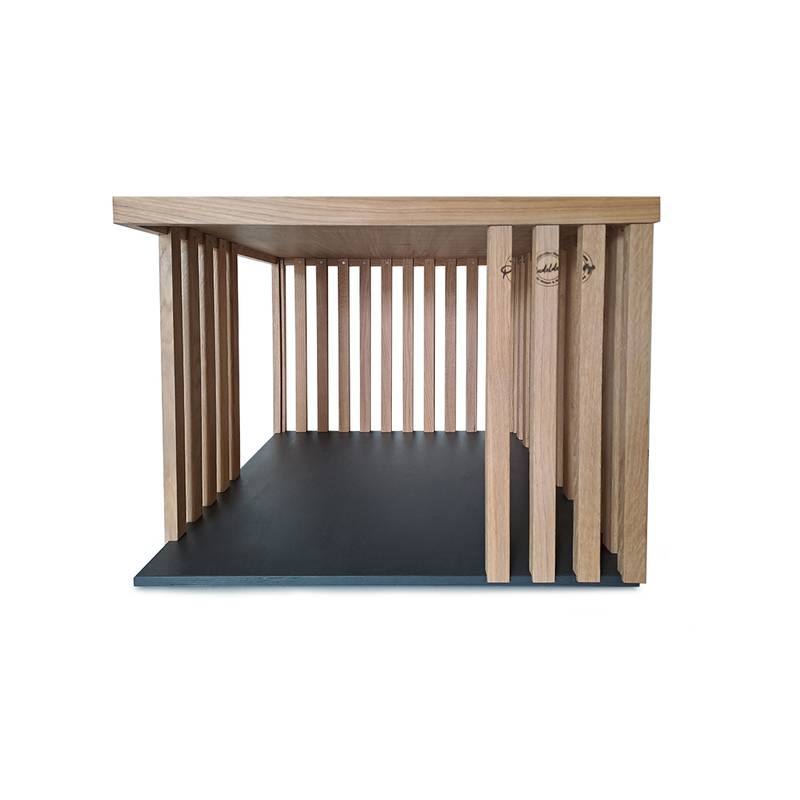Die Indoor Hundehütte "Klingelpütz" von Pudeldesign® wird in einer deutschen Möbelmanufaktur entworfen und in kleinen Auflagen aus hochwertigem Eichenholz gebaut.