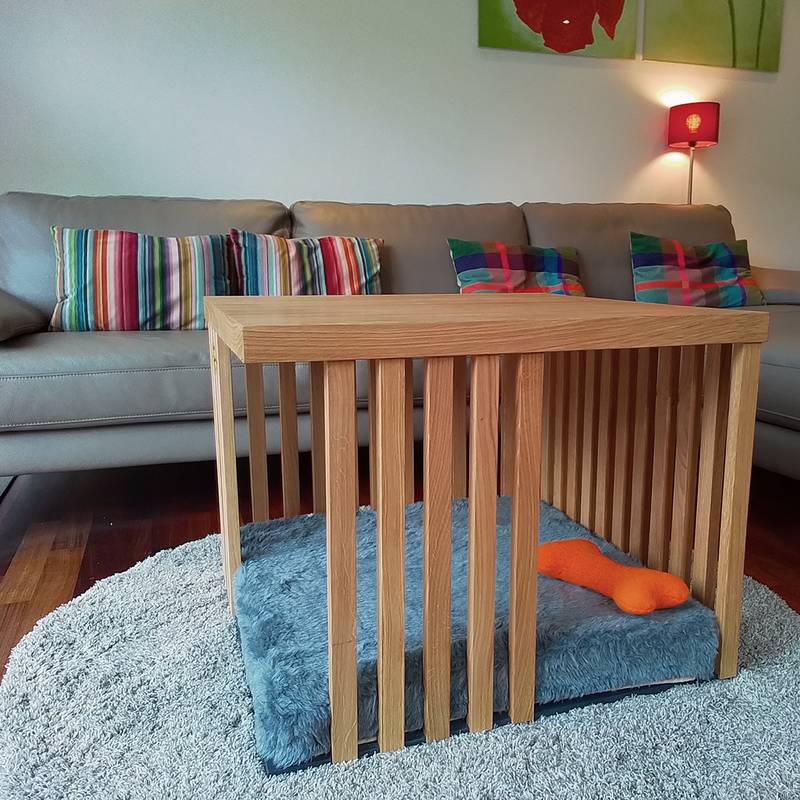 Vorbei die Zeiten, in denen ein Rückzugsort für den Hund gleichbedeutend war mit bisweilen gar schmerzhaften Kompromissen in Sachen Material, Raum und Ästhetik: mit dem Couchtisch-Hundebox-Hybrid "Klingelpütz" aus wohnlichem Eichenholz schlägst Du zwei Fliegen mit einer Klappe. Und das "in schön". Und gut. Ein echtes Manufakturmöbel.