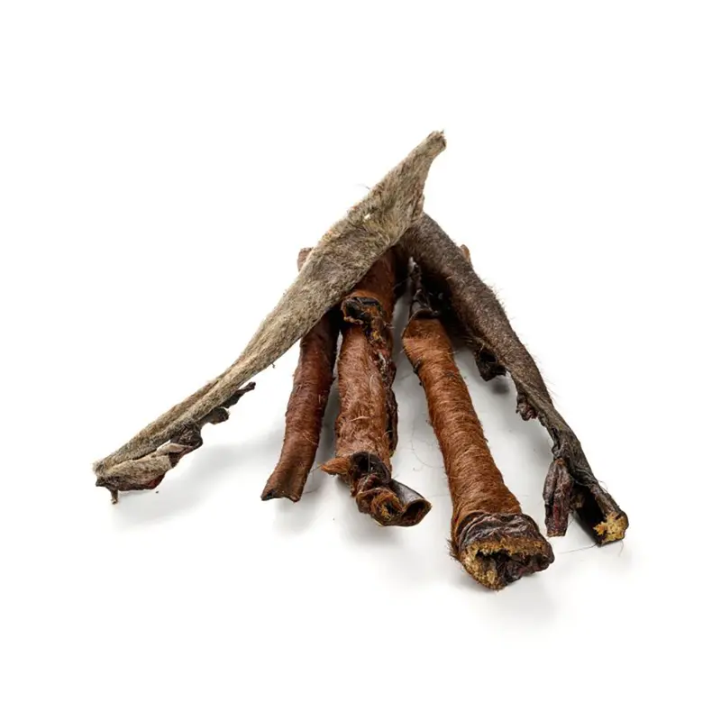 Neben dem ausgiebigen Kauerlebnis und der damit zusammenhängenden Unterstützung der Maulhygiene haben Kauprodukte mit Fell einen weiteren großen Vorteil: Fell besteht wie unsere Haare zum Großteil aus dem Protein Keratin. Dieses ist schwer- bis unverdaulich, behält also weitestgehend seine Struktur.