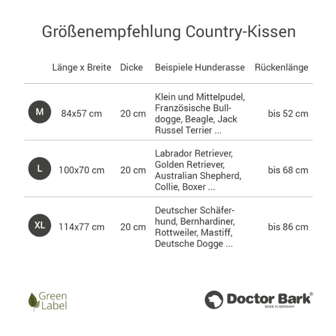 Natürlich gibt es das Doctor Bark® Green Label Country-Kissen auch in der richtigen Größe für Deinen Hund: