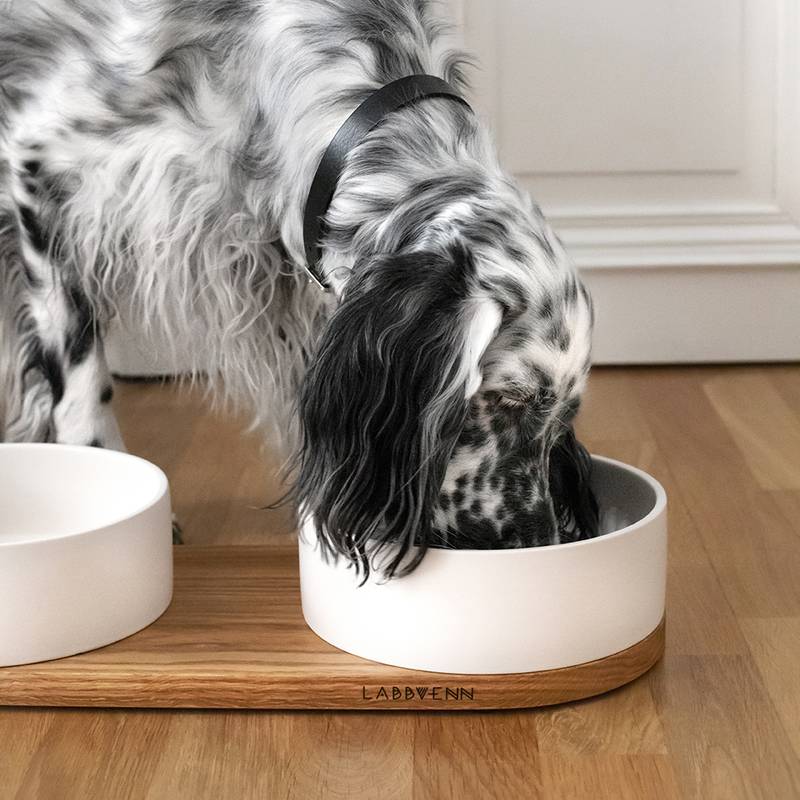 Zwei Keramiknäpfe, komplementiert von einer Basis aus massivem Eichenholz. So einfach – so schön.