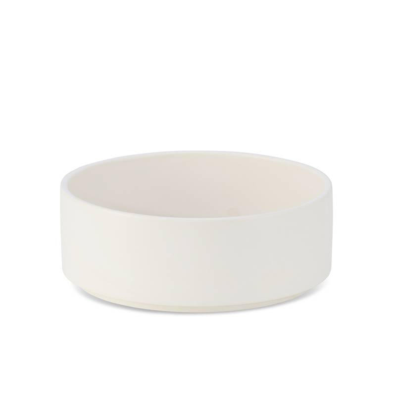 Die Futterstation aus Keramik und Holz – genauer: Eiche – VUKU in sanftem Taupe und frischem Weiß.