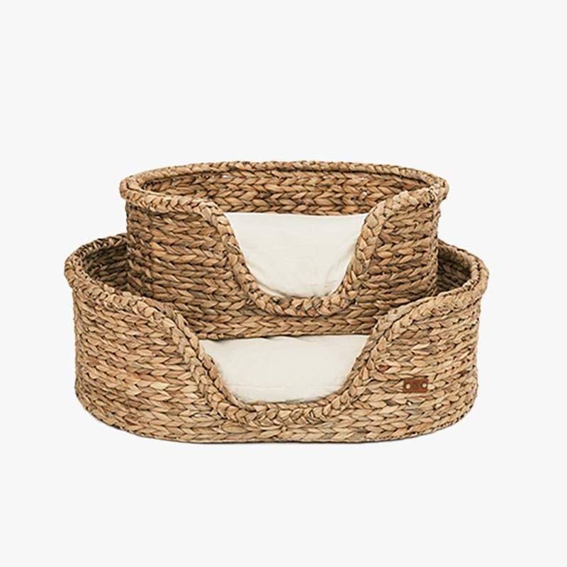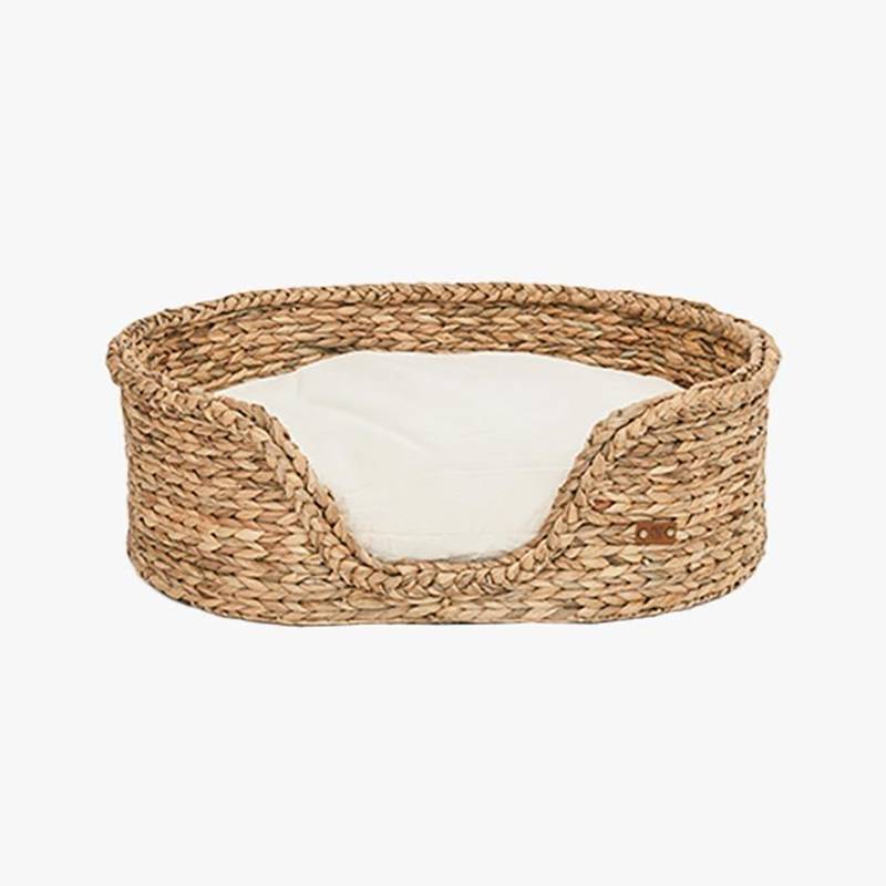 Das natürliche Flair des Geflechts wird unterstrichen von dem Hundekissen mit einem Bezug aus Baumwolle.