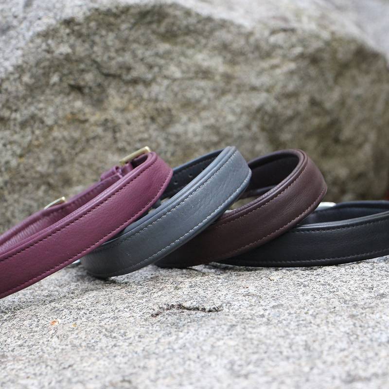 Robustes Rindsleder, unterlegt mit einer Polsterung aus weichem Nappaleder, ergänzt mit bruchfesten Beschlägen aus massivem Messing – schonend für Kehlkopf und Fell und optimal geeignet für den Alltag mit Deinem Hund.
