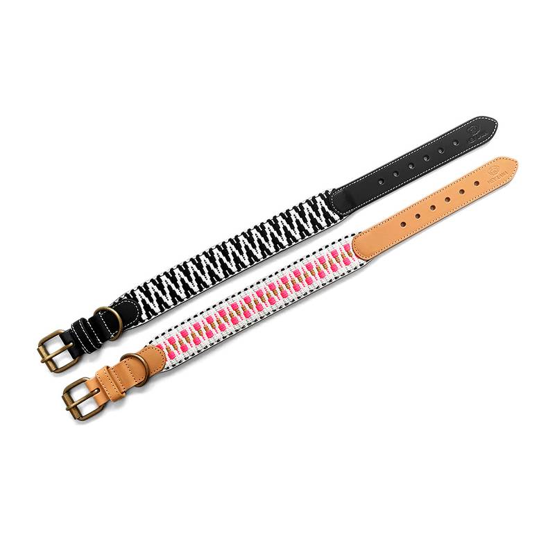 Die Lage aus gewebtem Bio-Baumwollband mit auffälligem Zickzack-Muster verleiht der Halsung die notwendige Stabilität und einen unverwechselbaren Charakter.