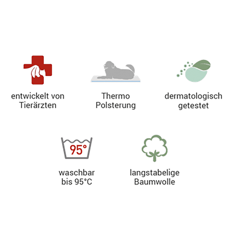 Dass die Hundedecke komplett bei über 90 Grad waschbar ist, hilft Deinem Allergiker-Hund, da bei diesen Temperaturen alles restlos entfernt wird.