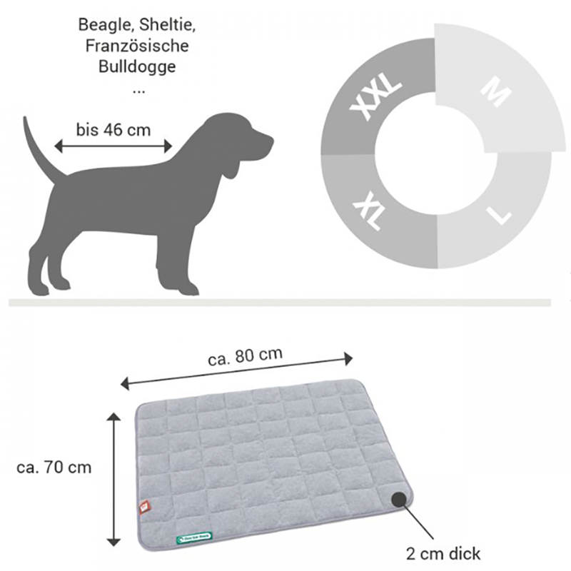 Die Hundedecke ist zwei Zentimeter dick – damit ist sie ein großartiger Zweitliegeplatz überall im Haus, aber auch auf Terrasse und Balkon oder gar unterwegs. Denn dank der Absteppungen lässt sie sich gut aufrollen und ist auch für unterwegs nicht zu sperrig. Und schon gar nicht fürs Sofa.