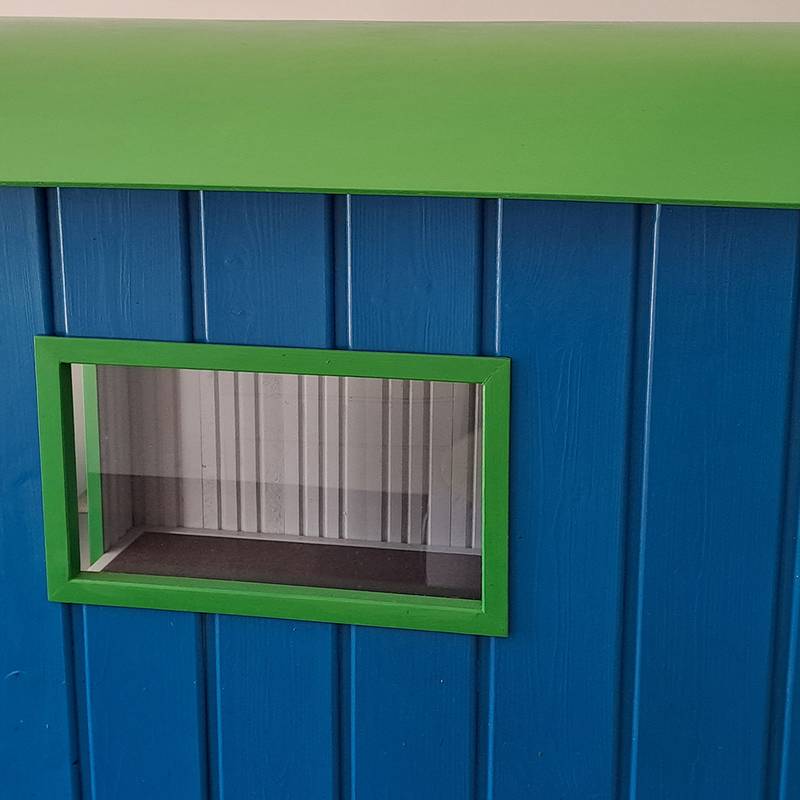 Natürlich kann der Bauwagen mit Fenster, und ausladendem, abnehmbarem Dach auch drinnen aufgestellt werden – zum Beispiel als Rückzugsort für burnoutgefährdete Bürohunde.