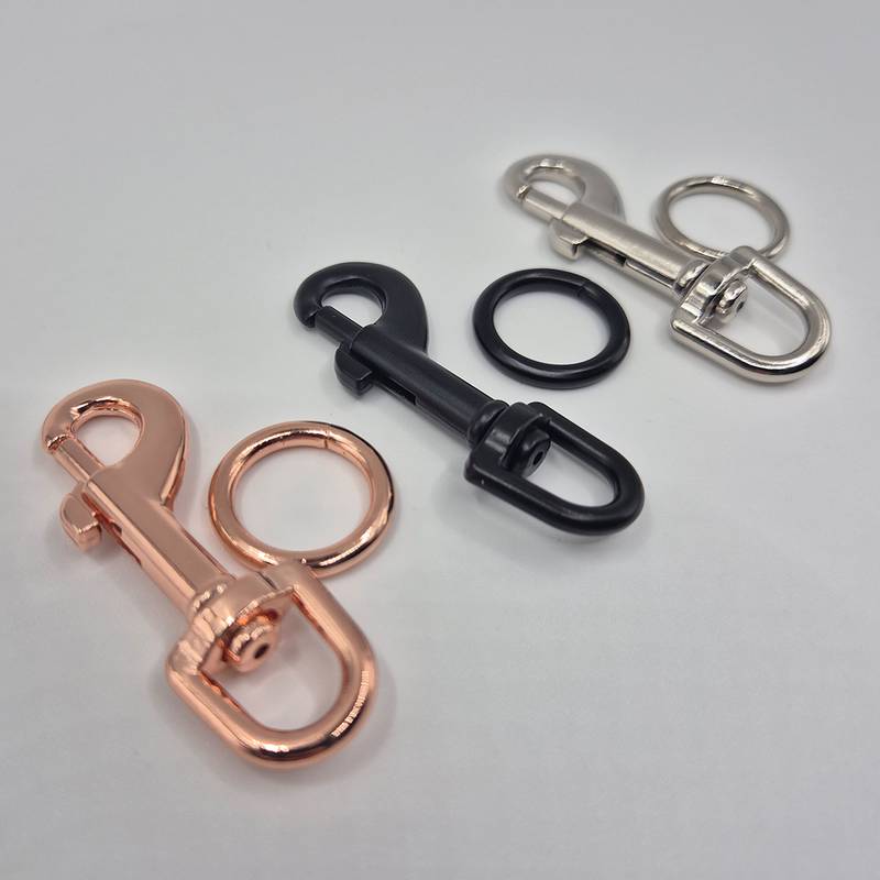 Bei den Schließen und D-Ringen hast Du die Wahl zwischen Zinkdruckguss in silberfarben, schwarz oder roségold.