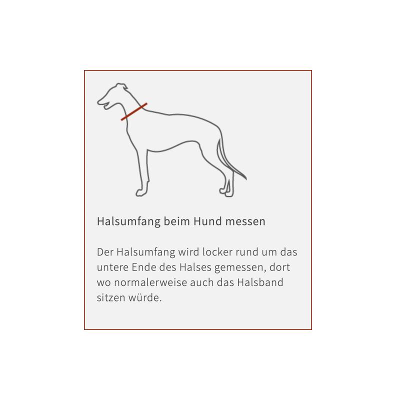 Dein Hund sollte zum Ausmessen ruhig stehen. Bitte beachte die Messanleitung und nimm die Maße gemäß der entsprechenden Abbildung ab. Am besten geht das mit einem Schneidermaßband, das Du nur leicht anlegst und nicht zu straff ziehst – ein Zeigefinger sollte noch darunter passen.