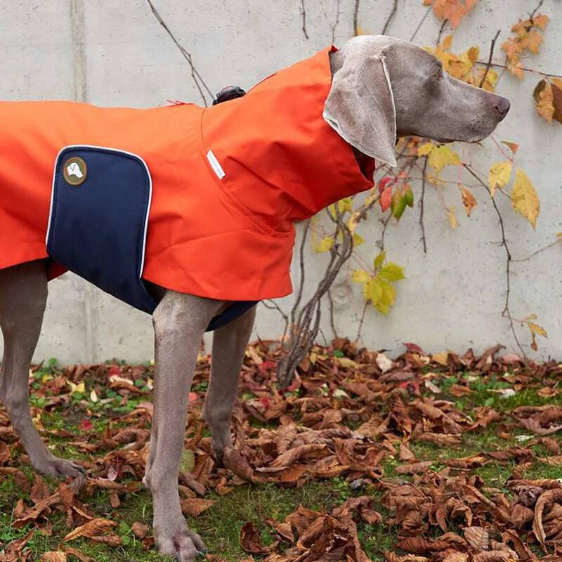 - Der bis 5.000 mm Wassersäule dichte Hundemantel wird in der Größe entsprechend der Rückenlänge des Hundes gewählt.