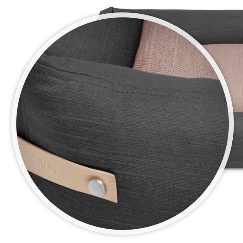 Wir geben zu: wir sind ein bisschen verliebt in STOKKE. Der Bezug aus einem in Leinenoptik fein strukturierten und robusten Polsterstoff in klassischem Dunkelgrau und zartem Altrosa, kombiniert mit einem Griff aus Echtleder mit Logoprägung wirkt edel und ist zugleich pflegeleicht. Noch stärker haben es uns allerdings die inneren Werte angetan: die Füllung aus PU-Schaum sorgt für gute Durchlüftung, ist atmungsaktiv, passt sich durch Körperwärme und -gewicht genau dem Hund an und ist auch noch waschbar.