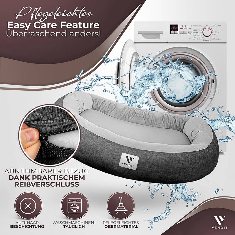 Das orthopädische Hundebett von Vendit ist wirklich pflegeleicht: die Anti-Haar-Beschichtung ermöglicht es Dir, Hundehaare einfach abzusaugen. Leichte Verschmutzungen können mit einem feuchten Tuch entfernt werden. Der Bezug ist abziehbar und für Maschinenwäsche geeignet.