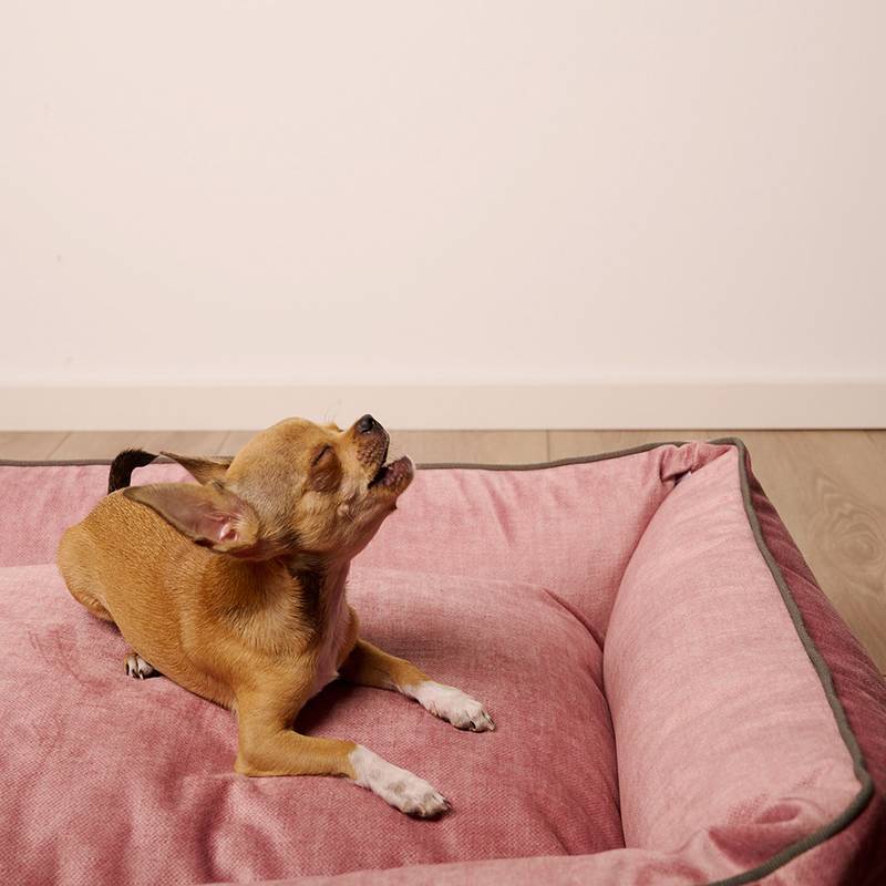 Ein Hundebett der Luxusklasse: GLAM von Laboni. Mit Samtbezug in Rosé.