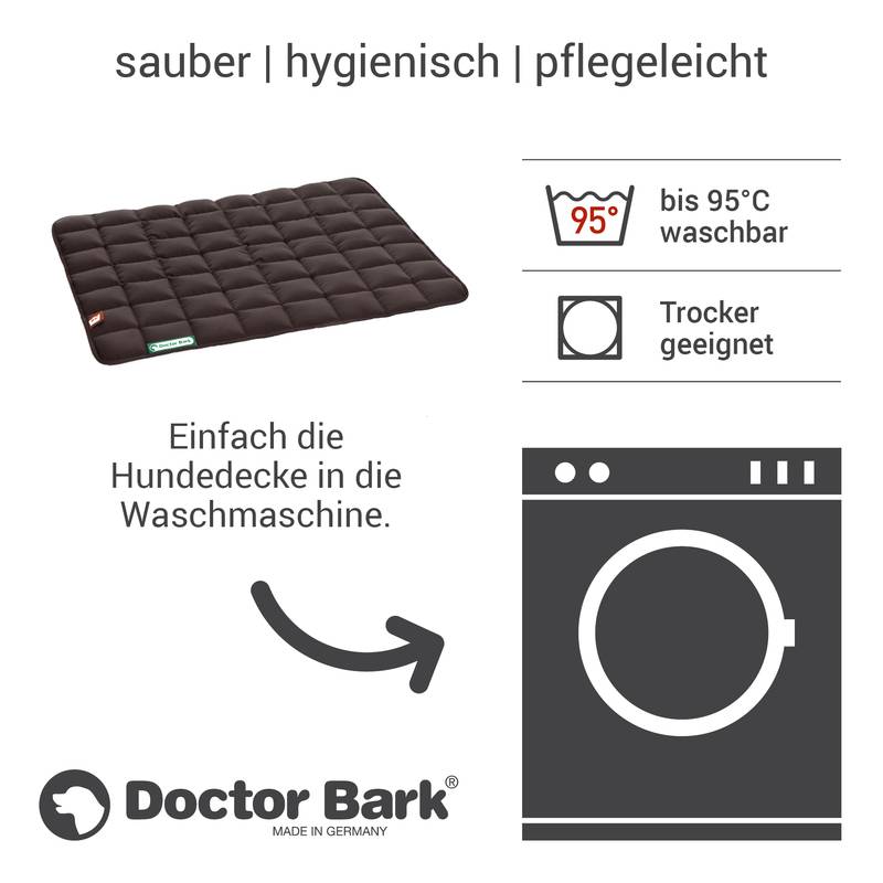 Alle Doctor Bark Steppdecken für Hunde werden im GANZEN bei 95°C gewaschen, nicht nur der Überzug.