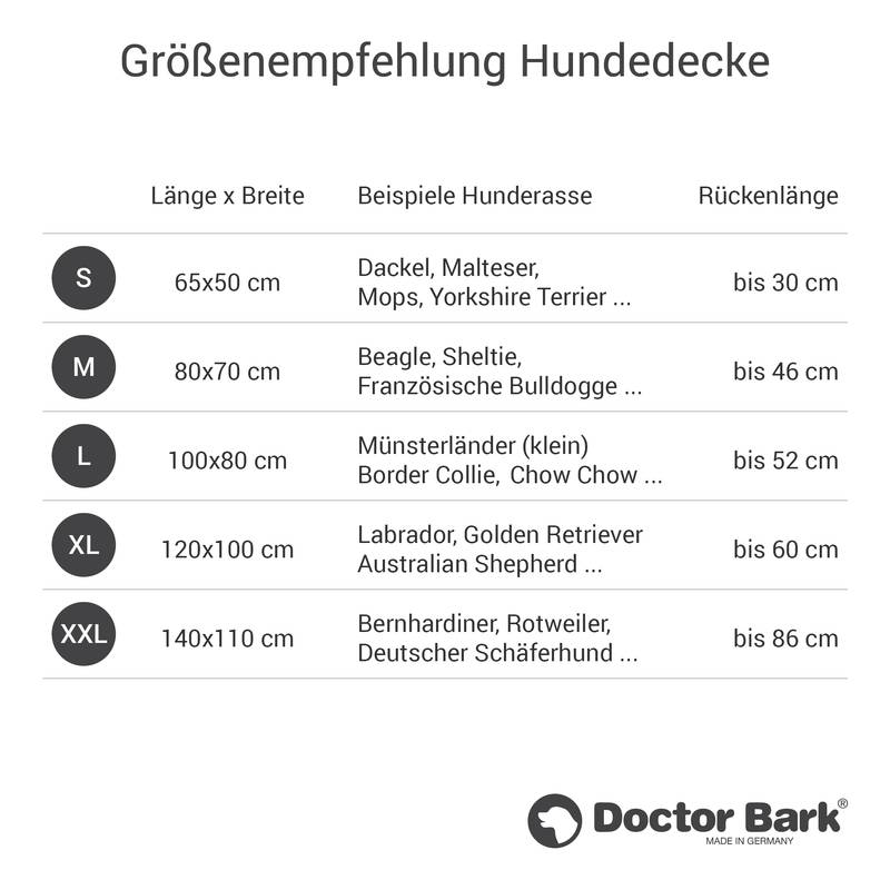 Größentabelle Doctor Bark® Steppdecke für Hunde
