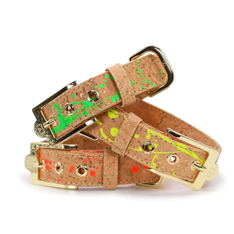 Das Halsband 'Signature' ist aus naturfarbenem Korkleder genäht und versprüht mit seinen farbigen Klecksen jede Menge Lebensfreude. Die messingfarbenen Beschläge setzen edle Akzente.