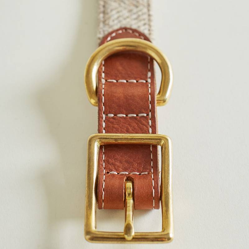Das edle Design des Halsbands wird durch die Applikation von britischem Tweed in Grau-Braun unterstrichen und aufgewertet. Tweed ist ein traditionelles Gewebe aus reiner Schurwolle, bekannt für seinen klassischen Charme und Langlebigkeit.