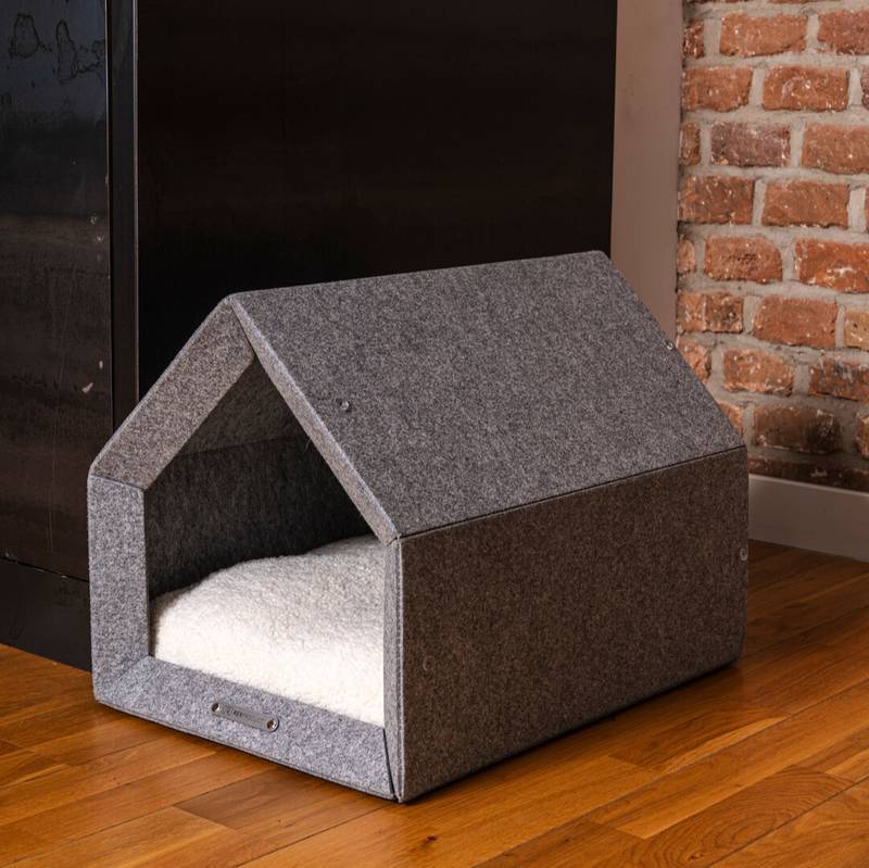 Eine stabile Indoor Hundehütte mit flauschigem Teddyplüsch-Liegekissen – ein nachhaltiger und gemütlicher Rückzugsort für Deinen Hund.