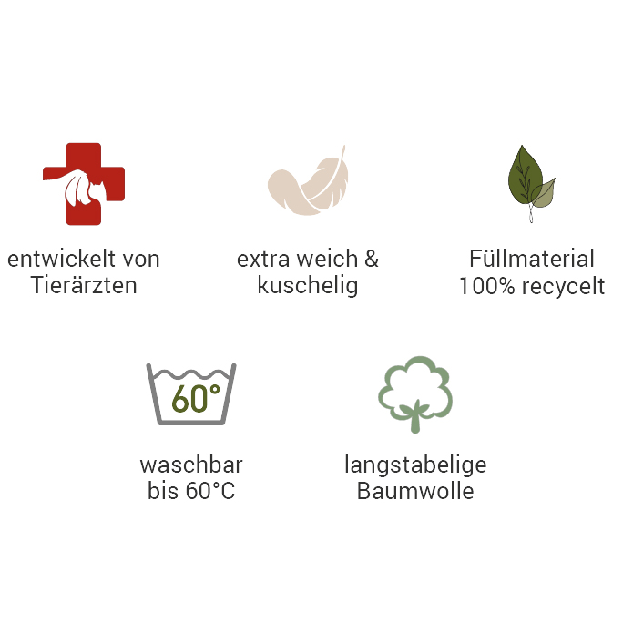 Nach Abschütteln von Hundehaaren auf der Liegefläche und Vorbehandlung eventueller hartnäckiger Flecken mit Gallseife oder etwas Flüssigwaschmittel kann einfach das komplette Hundekissen in die Waschmaschine wandern – bei 60 Grad!
