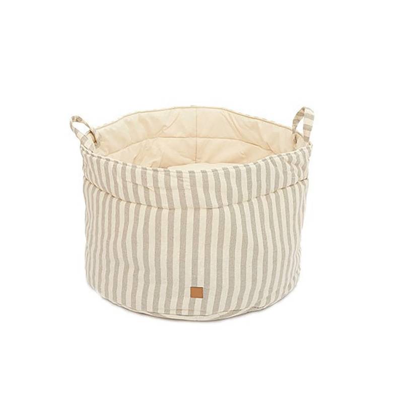 Der hyggelig cremefarben und taub gestreifte Bezug aus 100% Baumwolle ist geprüft schadstofffrei und robust – auch häufigeres Abstellen auf dem Boden, Körbchenbuddeln und Maschinenwäsche können dem Canvas-Gewebe kaum etwas anhaben.