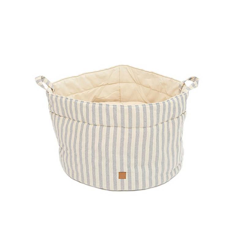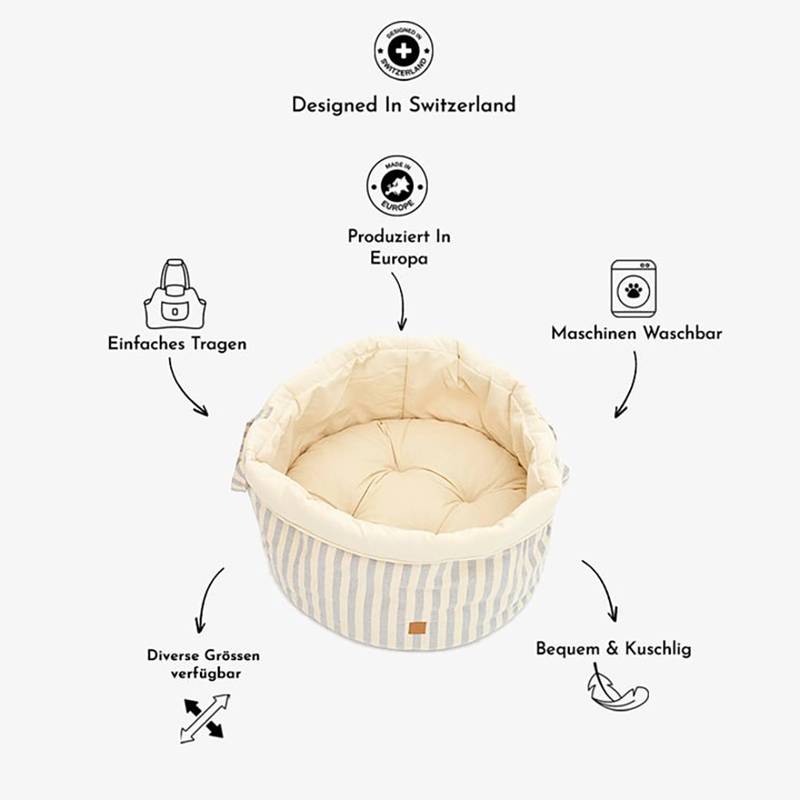 Der maritim gestreifte Bezug aus 100% Baumwolle ist geprüft schadstofffrei und robust – auch häufigeres Abstellen auf dem Boden, Körbchenbuddeln und Maschinenwäsche können dem Canvas-Gewebe kaum etwas anhaben.