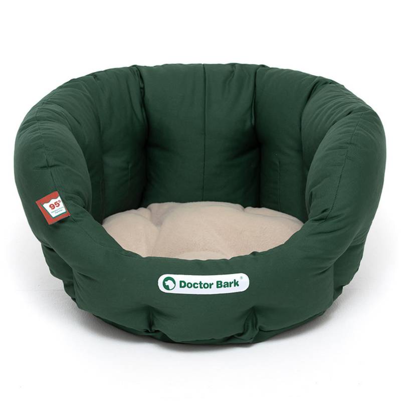 Ein kuscheliger Schlafplatz in DUNKELGRÜN und BEIGE für kleine Hunde von Doctor Bark® – waschbar bei 95°C und ein farbiger Hingucker in jedem Raum.