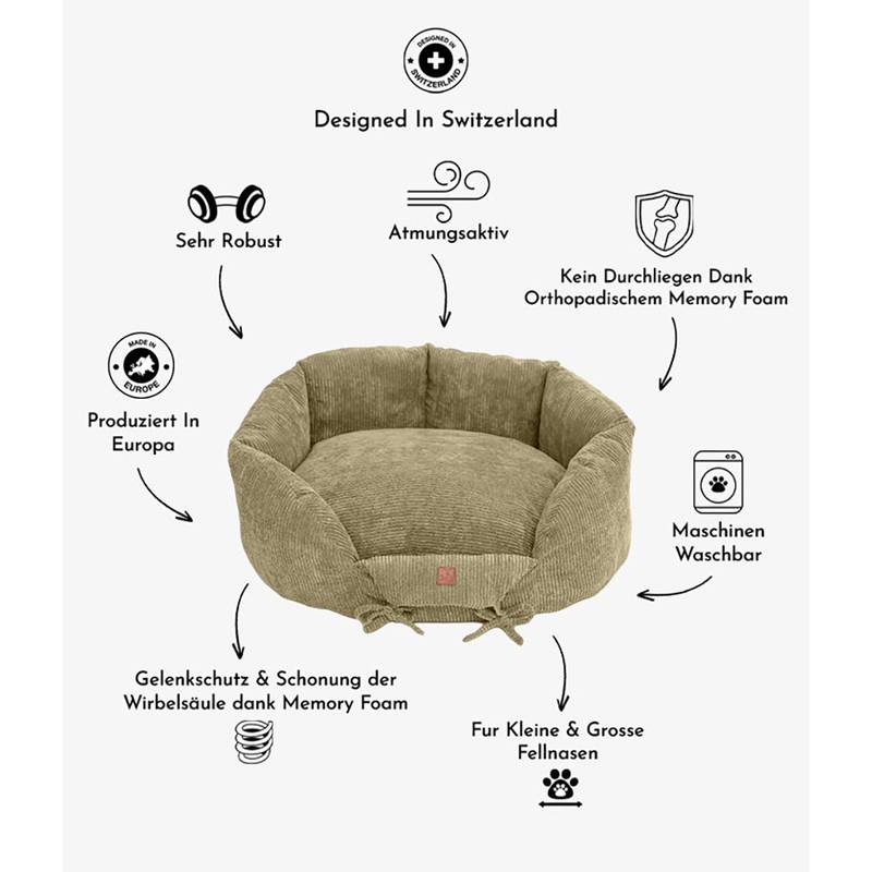 Beim Entwurf des Hundenestchens "Ronny" stand Behaglichkeit ganz oben auf der Liste. Der Bezug aus Cordsamt ist anschmiegsam und bringt ganz nonchalant ein lässiges Flair in Dein Zuhause – ob Vintage, BoHo, modern oder Landhausstil, Ronny macht alles mit.