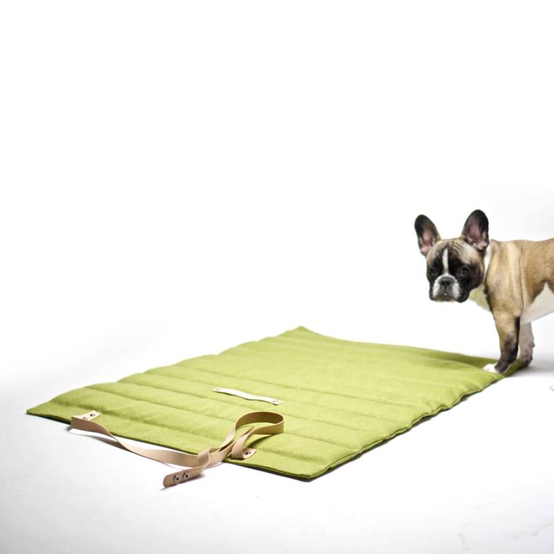 FOSSER, das Hundereisebett von Labbvenn® in frischem Grün – die perfekte Ruheinsel für kurze Pausen oder eine Nacht im Hotel.