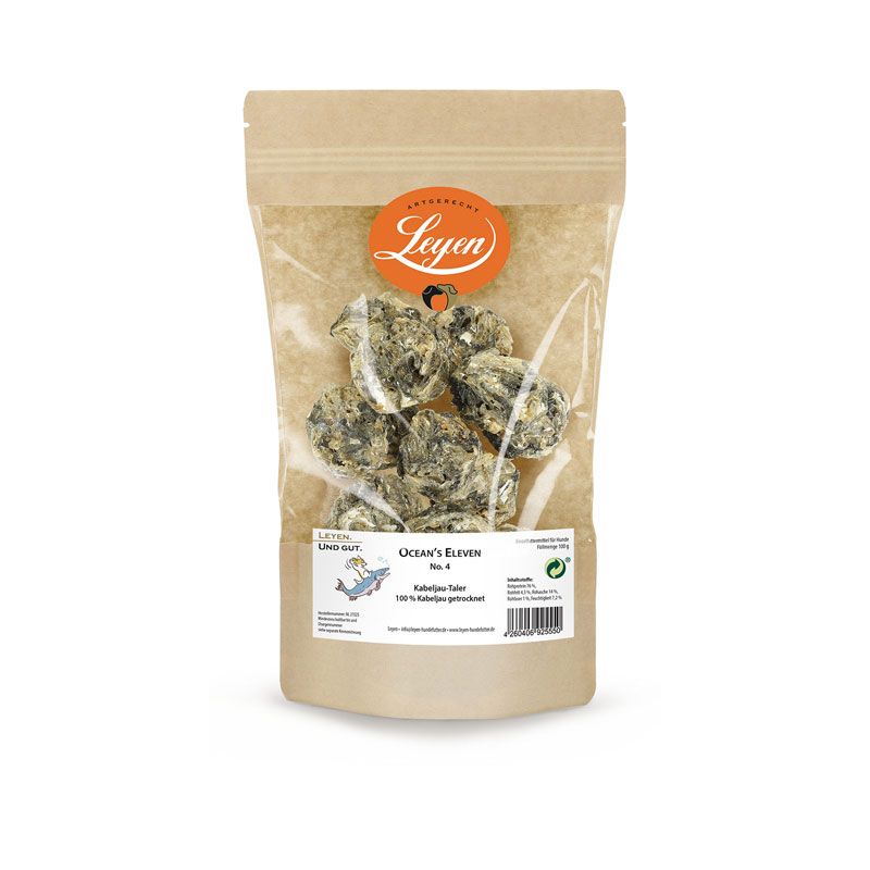 100% Kabeljau, naturbelassen getrocknet und zu einem besonderen, köstlichen Kabeljau-Taler gepresst – für Hunde aller Altersgruppen geeignet und auch für solche, die unter Unverträglichkeiten neigen.
